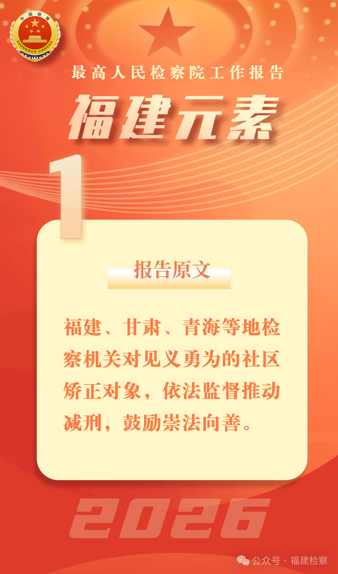 2024年8月,社区矫正对象王某在接受社区矫正期间,于闽江某河段勇救一名溺水老人,被授予“见义勇为先进分子”称号。福州检察机关在监督中发现这一情况并开展调查核实,王某属缓刑考验期内重大立功,符合减刑条件。2025年3月,检察机关发出检察建议,依法督促相关部门对王某提请减刑。经审理,法院依法裁定减去王某有期徒刑九个月,缩减缓刑考验期九个月。该案报道《缓刑期内见义勇为,法律监督支持善举》在检察日报首发后,被人民日报、中国新闻社、中央政法委等官微转发,引领法治风尚、弘扬社会主义核心价值观。
